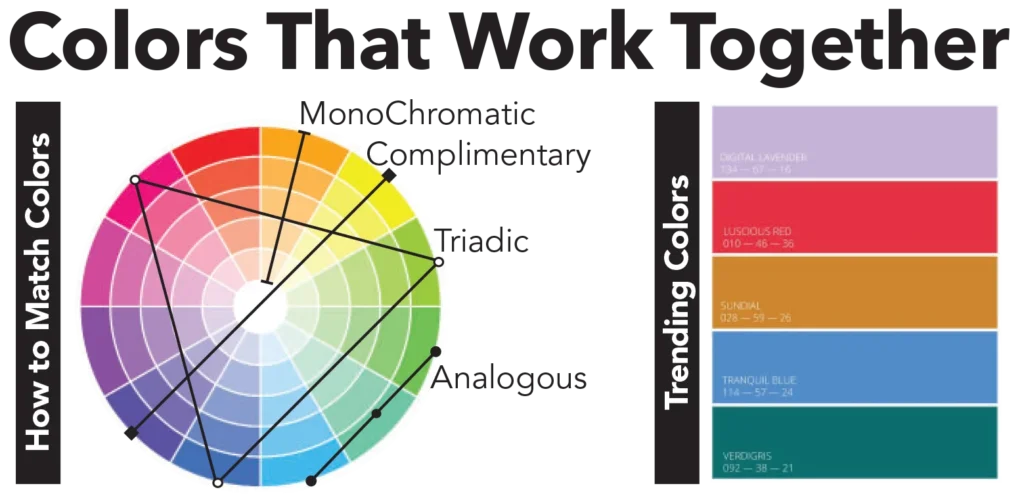- Triadic color schemes are composed of three hues that are evenly spaced around the color wheel.