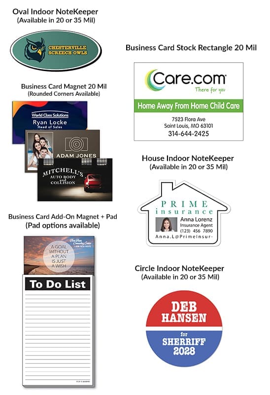 - Business Card, Notekeepers in various shapes, & Magnets with writing pads